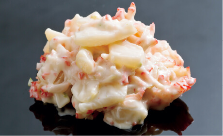 イカとカニ風味かまぼこを合わせ、マヨネーズ仕立てでまろやかに仕上げた彩りサラダです。