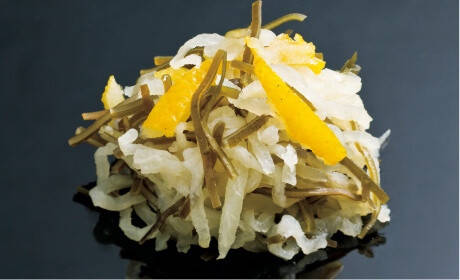 国産大根のなますに、国産柚子の爽やかさと北海道産昆布の旨みを添えました。