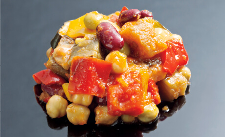 イタリア産焼き野菜と3種の豆を、トマトソースでじっくり煮込んだ彩り豊かな一品。